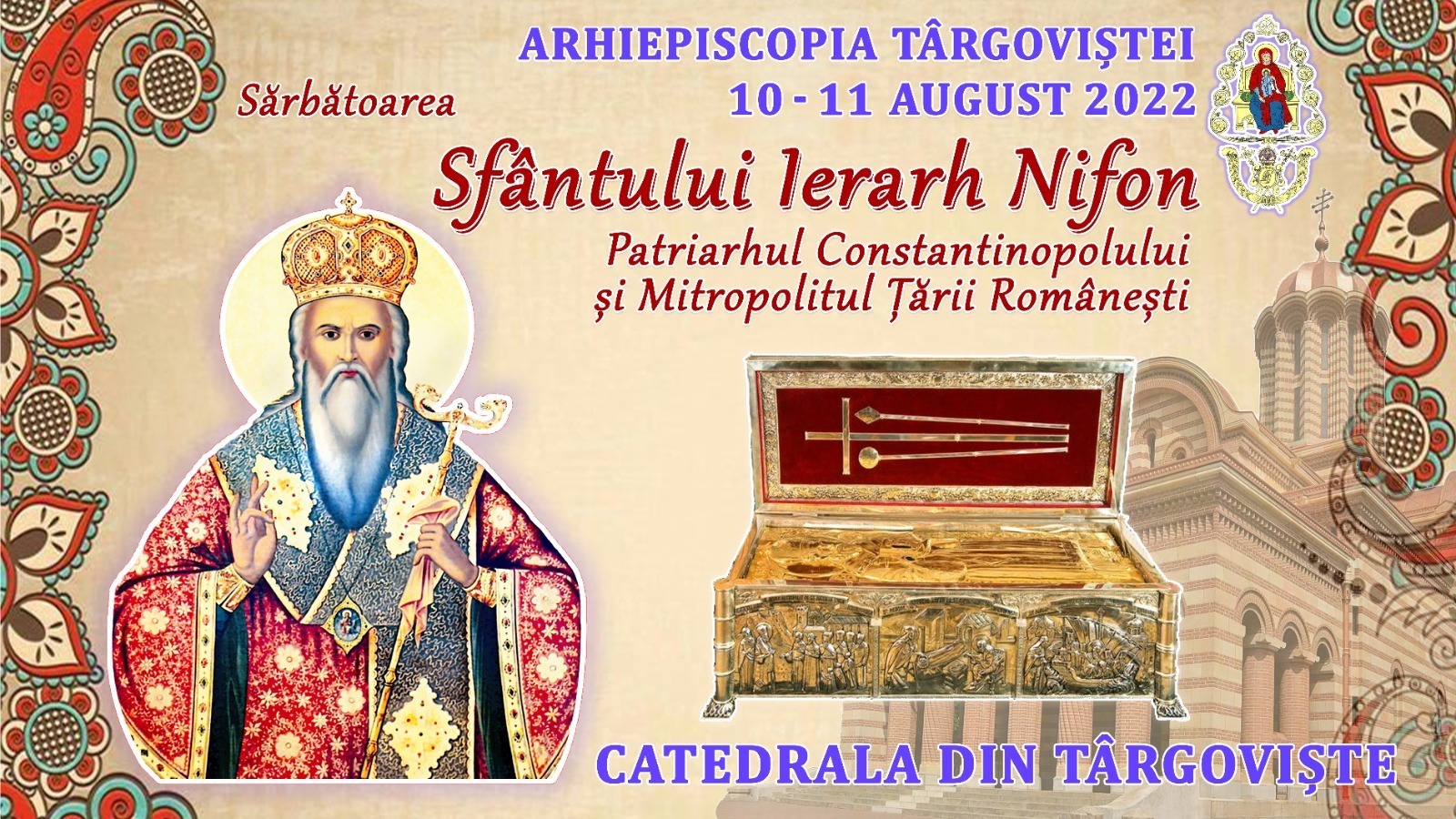 În zilele de 10 și 11 august 2022, ne vom bucura împreună, de sărbătoarea Sf. Ierarh Nifon, Patriarhul Constantinopolului şi Mitropolitul Ţãrii Româneşti, ocrotitorul Arhiepiscopiei Târgoviștei. Pentru buna desfășurare a sărbătorii: