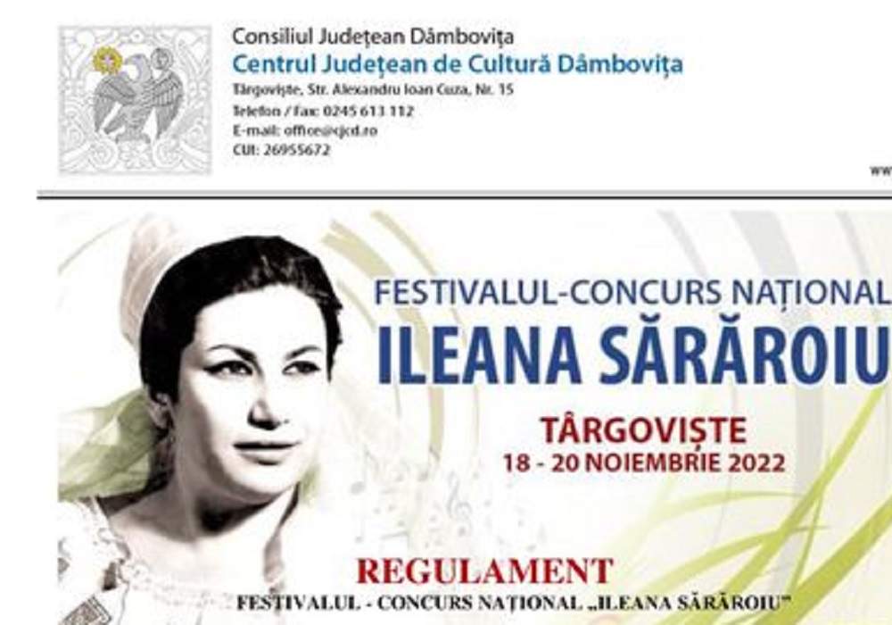 În perioada 18-20 noiembrie 2022, Consiliul Județean Dâmbovița, prin Centrul Județean de Cultură Dâmbovița, va organiza, la Târgoviște, FESTIVALUL – CONCURS NAŢIONAL „ILEANA SĂRĂROIU”, ediția a IX-a.