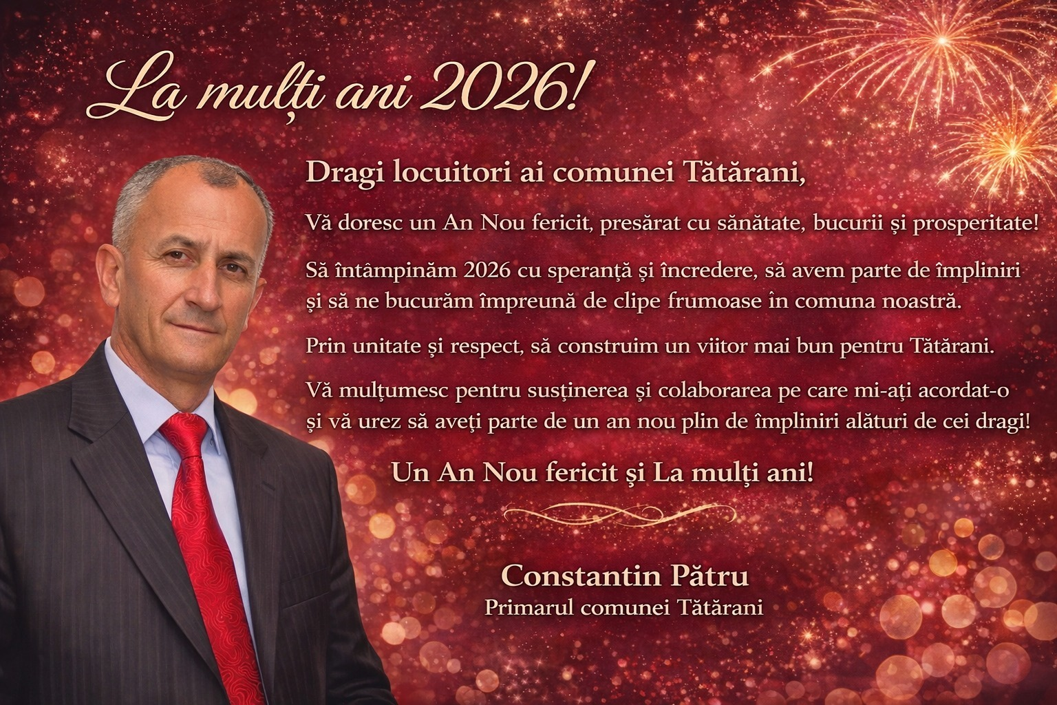 Gânduri de Anul Nou 2026 transmise de primarul Constantin Pătru tuturor locuitorilor comunei Tătărani Share on TwitterTweet Share on Pinterest Share Share on LinkedIn Share Share on Digg Share