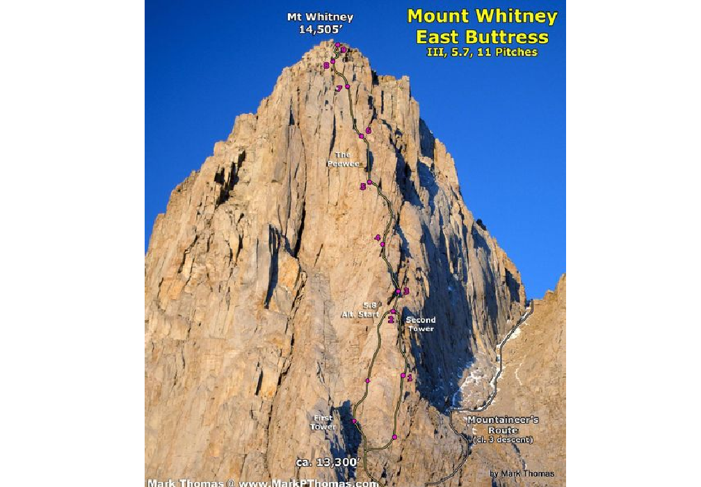 Accesul se face pe North Fork Lone Pine, o vale surprinzător de sălbatică, care ne duce spre ultimul prag glaciar situat la 3850 m. De aici și pînă în jurul cotei de 4000 m se ajunge printr o cățărare ușoară, nefiind necesară legarea în coardă, după care încep lucrurile mai serioase.
