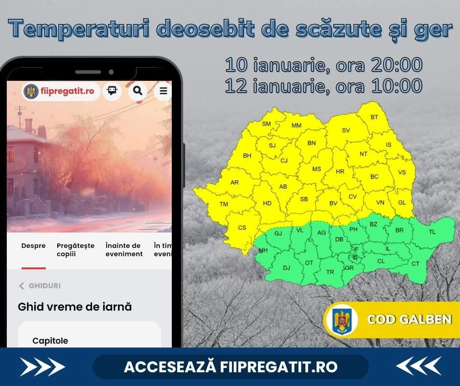 Temperaturile extrem de scăzute și gerul persistent continuă să afecteze mai mult de jumătate din teritoriul țării, determinând autoritățile să avertizeze populația asupra riscurilor asociate acestor condiții meteo severe. Meteorologii au emis o atenționare de cod galben, care vizează valori termice deosebit de scăzute, cu temperaturi minime cuprinse între -18 și -6 grade Celsius, ce pot pune în pericol sănătatea și siguranța cetățenilor.