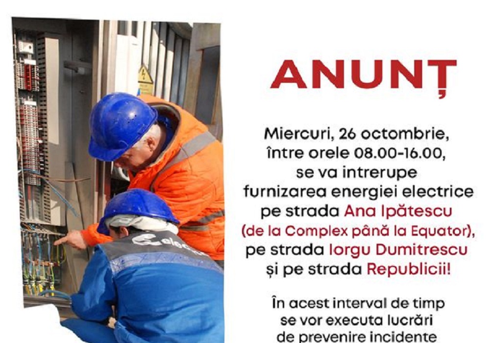Miercuri, 26 octombrie, între orele 08.00-16.00, se va intrerupe furnizarea energiei electrice pe strada Ana Ipătescu (de la Complex până la Equator), pe strada Iorgu Dumitrescu și pe strada Republicii!