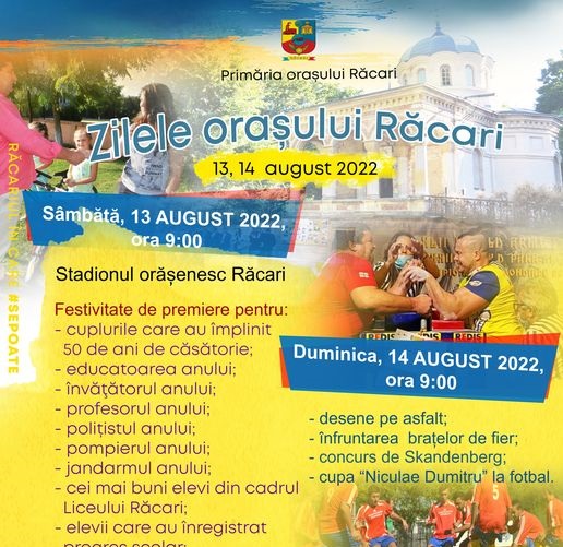 #50deAniCăsătorie#EducatoareaAnului#ÎnvăţătorulAnului#ProfesorulAnului#PolițistulAnului#PompierulAnului#JandarmulAnului#CeimaiBuniElevidinCadrulLiceuluiRăcari#EleviicuProgresȘcolar#GospodariiAnului#DesenepeAsfalt#ÎnfruntareaBrațelorDeFier#ConcursdeSkandenberg#CupaNiculaeDumitrulafotbal.