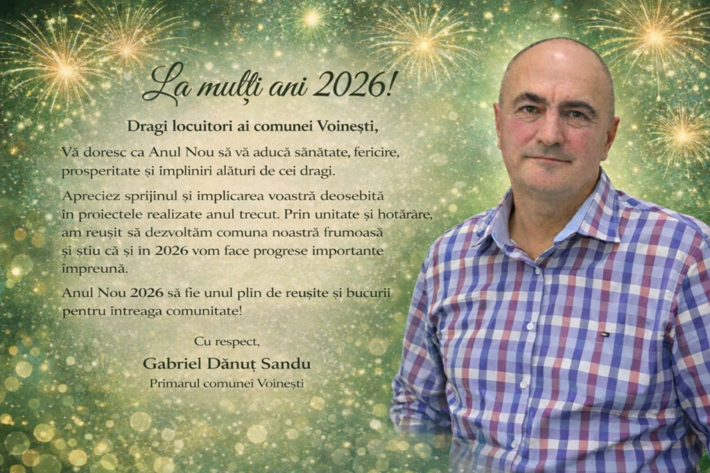 Mesaj pentru comunitatea din Voinești din partea primarului Gabriel Dănuț Sandu: Anul Nou începe cu speranță și unitate! Share on TwitterTweet Share on Pinterest Share Share on LinkedIn Share Share on Digg Share