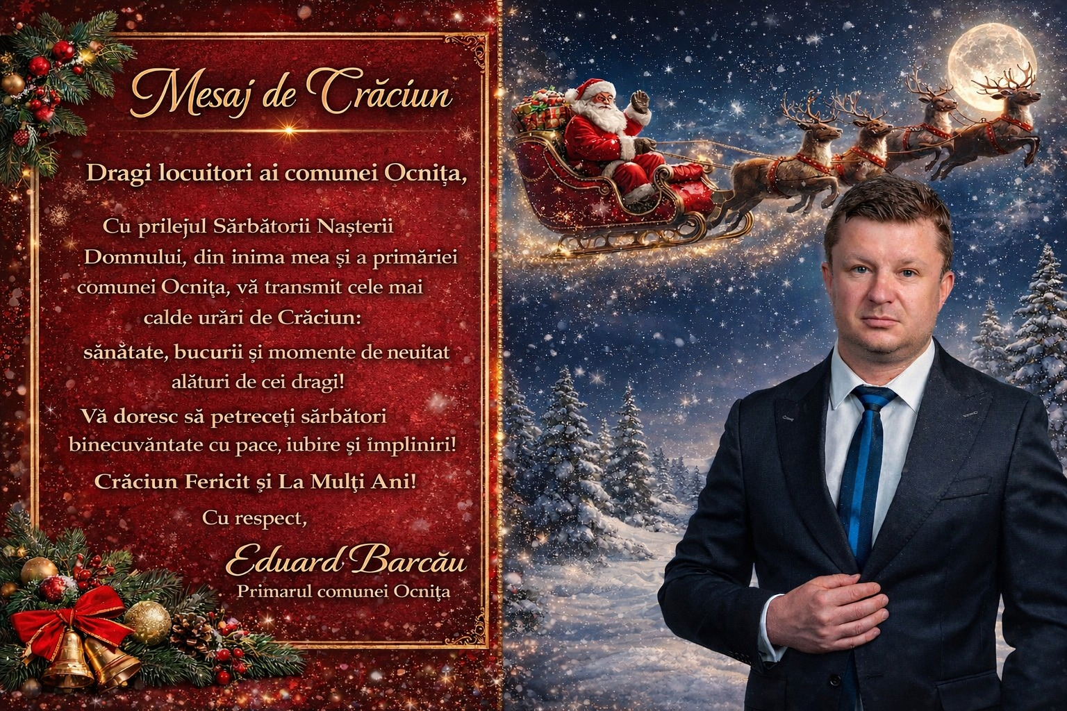Mesajul de Crăciun adresat locuitorilor comunei Ocnița, transmis de primarul Eduard Barcău, cu prilejul Sfintei Sărbători a Nașterii Domnului, în spiritul bucuriei, speranței și al momentelor de neuitat petrecute alături de cei dragi