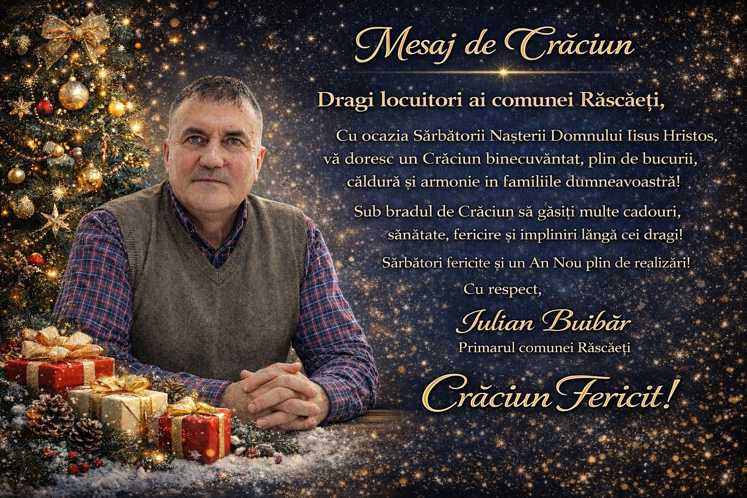 Mesajul de Crăciun adresat locuitorilor comunei Răscăeți, transmis de primarul Iulian Buibăr, cu prilejul Sfintei Sărbători a Nașterii Domnului Share on TwitterTweet Share on Pinterest Share Share on LinkedIn Share Share on Digg Share