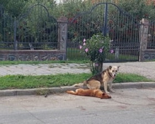 O cățelușă a fost lovită de mașină, în Curtea de Argeș, iar prietenul ei de joacă, un câine din vecini, a rămas alături de ea și a vegheat-o.