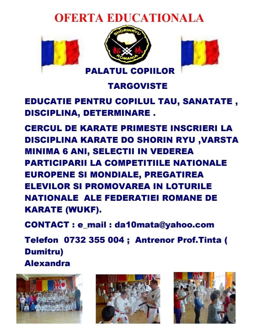 Palatul Copiilor din Târgoviște își deschide porțile pentru toți cei care vor să își dezvolte copilul într-un mediu sănătos, bazat pe disciplină și determinare. Cercurile de activități oferă posibilitatea practicării artei marțiale Karate Do Shorin Ryu, o disciplină care îmbină pregătirea fizică, mentală și morală. Participarea la cursurile de karate aduce numeroase beneficii copiilor: dezvoltarea autocontrolului și a respectului față de ceilalți, îmbunătățirea condiției fizice și a coordonării, precum și formarea unei atitudini perseverente și echilibrate. Înscrierile sunt deschise pentru copiii cu vârsta minimă de 6 ani, iar cei care demonstrează talent și perseverență au șansa să participe la competiții naționale, europene și mondiale, sub egida Federației Române de Karate (WUKF). Elevii sunt antrenați pentru a face față selecțiilor, pentru a atinge un nivel tehnic ridicat și pentru a putea fi promovați în loturile naționale. Cei interesați pot obține mai multe informații la adresa de email da10mata@yahoo.com sau la numărul de telefon 0732 355 004, persoană de contact fiind antrenorul Prof. Țintă Dumitru Alexandra.