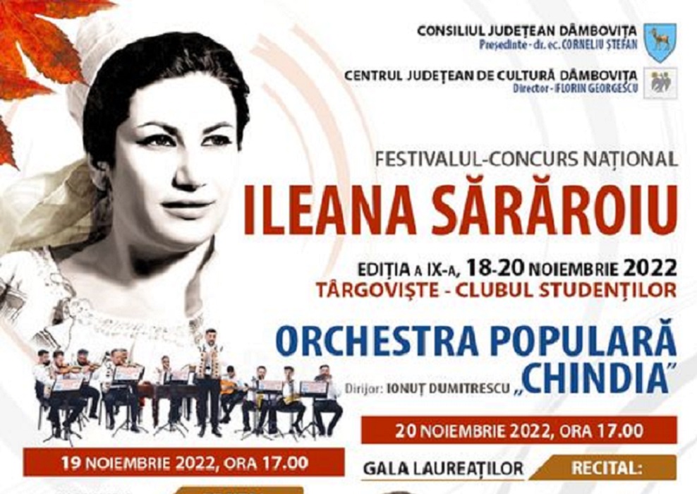 Pentru a aduce omagiul binemeritat vieţii şi carierei celei care a fost Ileana Sărăroiu, Consiliul Județean Dâmbovița, prin Centrul Judeţean de Cultură, va organiza, în perioada 18 – 20 noiembrie 2022, cea de-a IX-a ediţie a Festivalului-Concurs Național „Ileana Sărăroiu”.