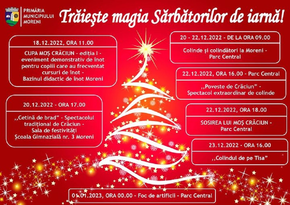 Municipalitatea morenară a pregătit pentru următoarea perioadă o serie de acțiuni și activități specifice sărbătorilor care vin: spectacole extraordinare de colinde susținute de performerii de la Școala Art Canto Morena, Clubul Copiilor, sosirea lui Moș Crăciun, primirea colindătorilor și multe alte surprize pentru copii și nu numai la care administrația locală și colegii noștri au lucrat în ultimele săptămâni.