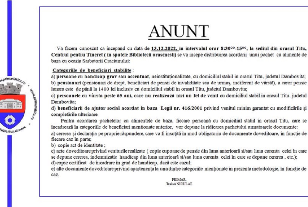 Pentru acordarea pachetelor cu alimentele de baza, fiecare persoană cu domiciliul stabil în orasul Titu, care se încadrează în categoriile de beneficiari mentionate anterior, vor depune la ridicarea pachetului urmatoarele documente: