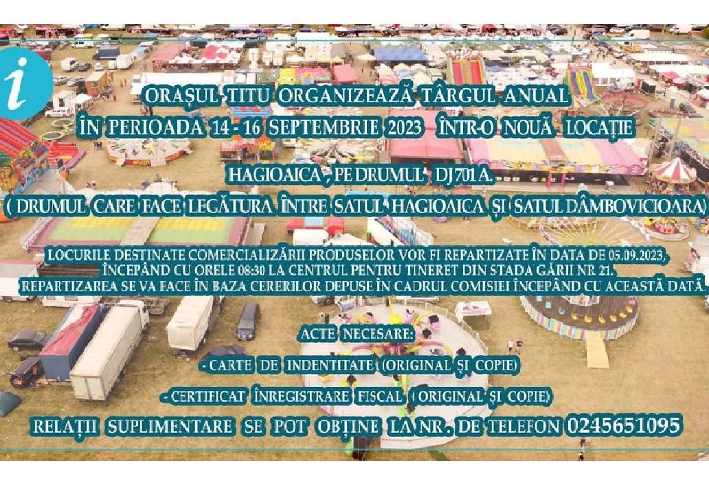 Orașul Titu organizează Târgul anual în perioada 14-16 septembrie 2023 într-o nouă locație – Hagioaica , pe drumul DJ 701 A. (Drumul care face legătura între satul Hagioaica și satul Dâmbovicioara)