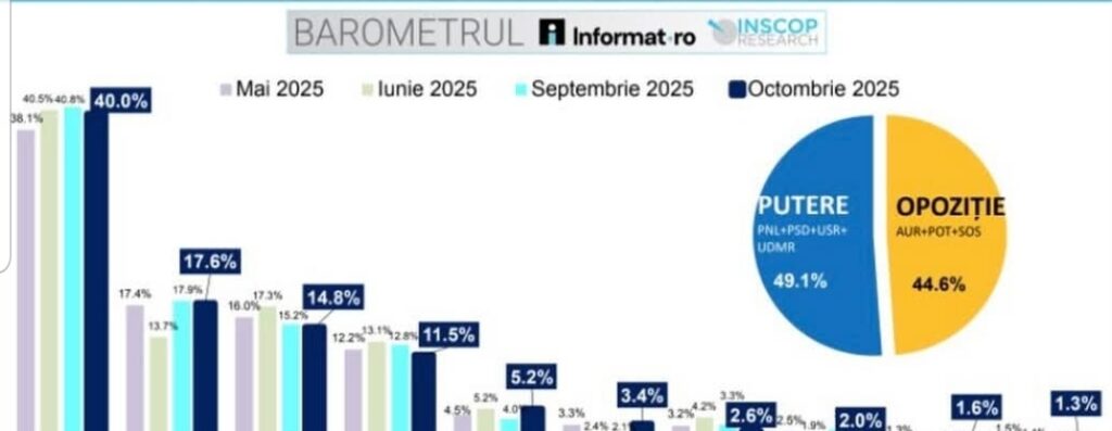Sondaj INSCOP octombrie 2025: AUR ajunge la 40% și se detașează clar în preferințele electorale, în timp ce PSD și PNL scad sub pragul de 20%, iar USR urcă ușor la peste 11%!